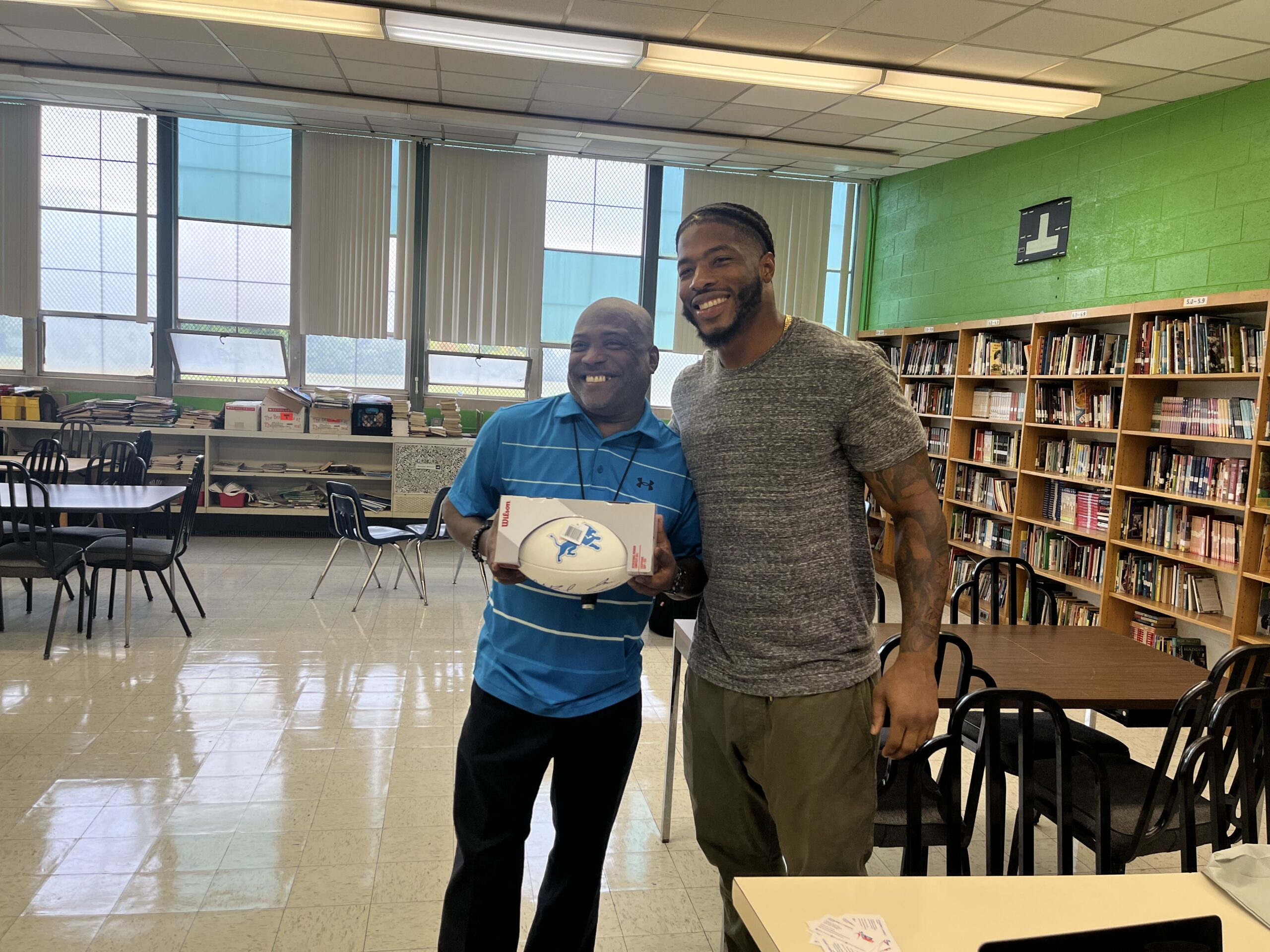 The smiles on the student’s faces as they watched two NFL football players walk into their classroom could’ve lit up a whole neighborhood. Cabinda even had the lunchroom roaring with cheers as he walked through, signaling them to get louder.